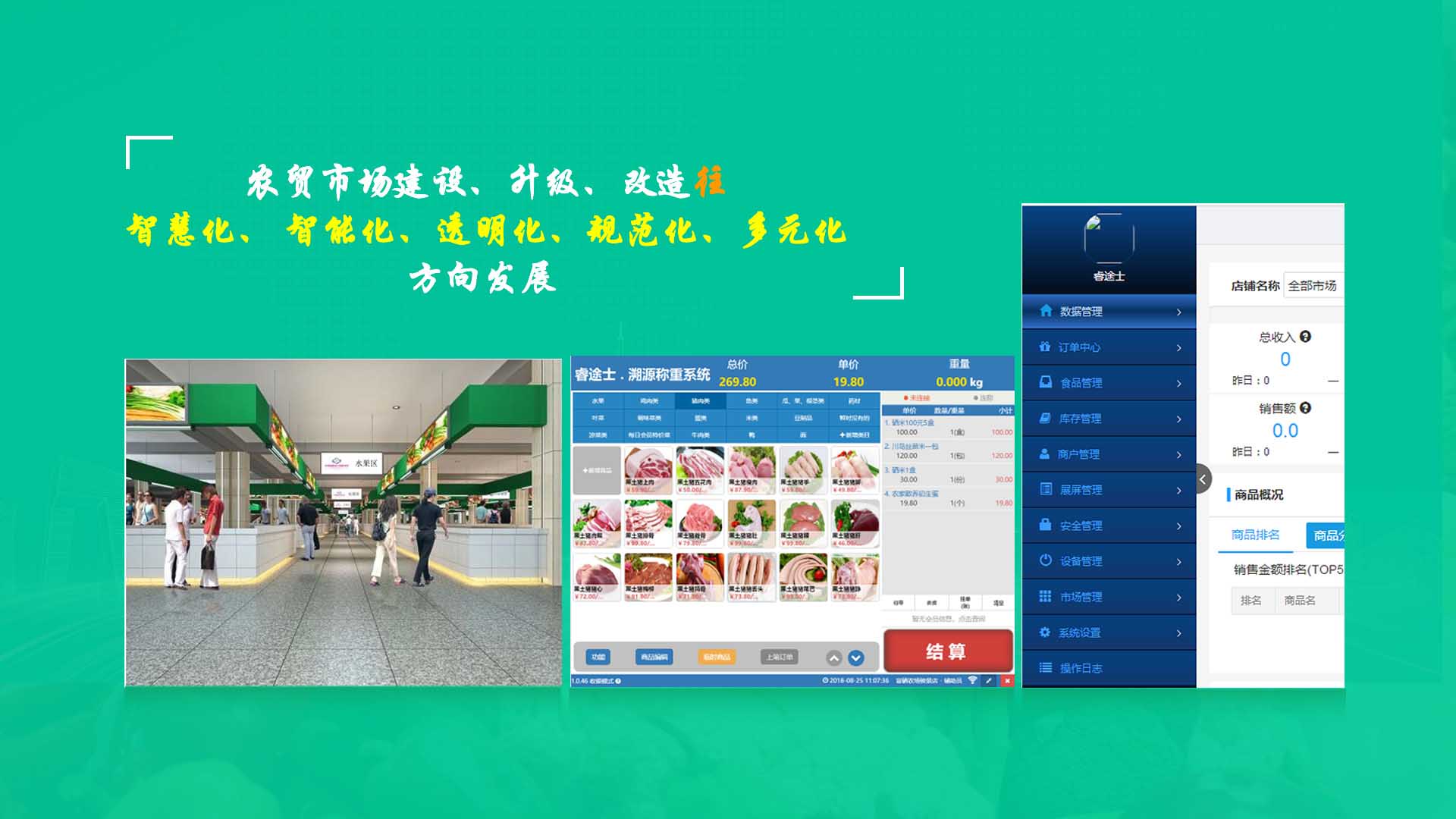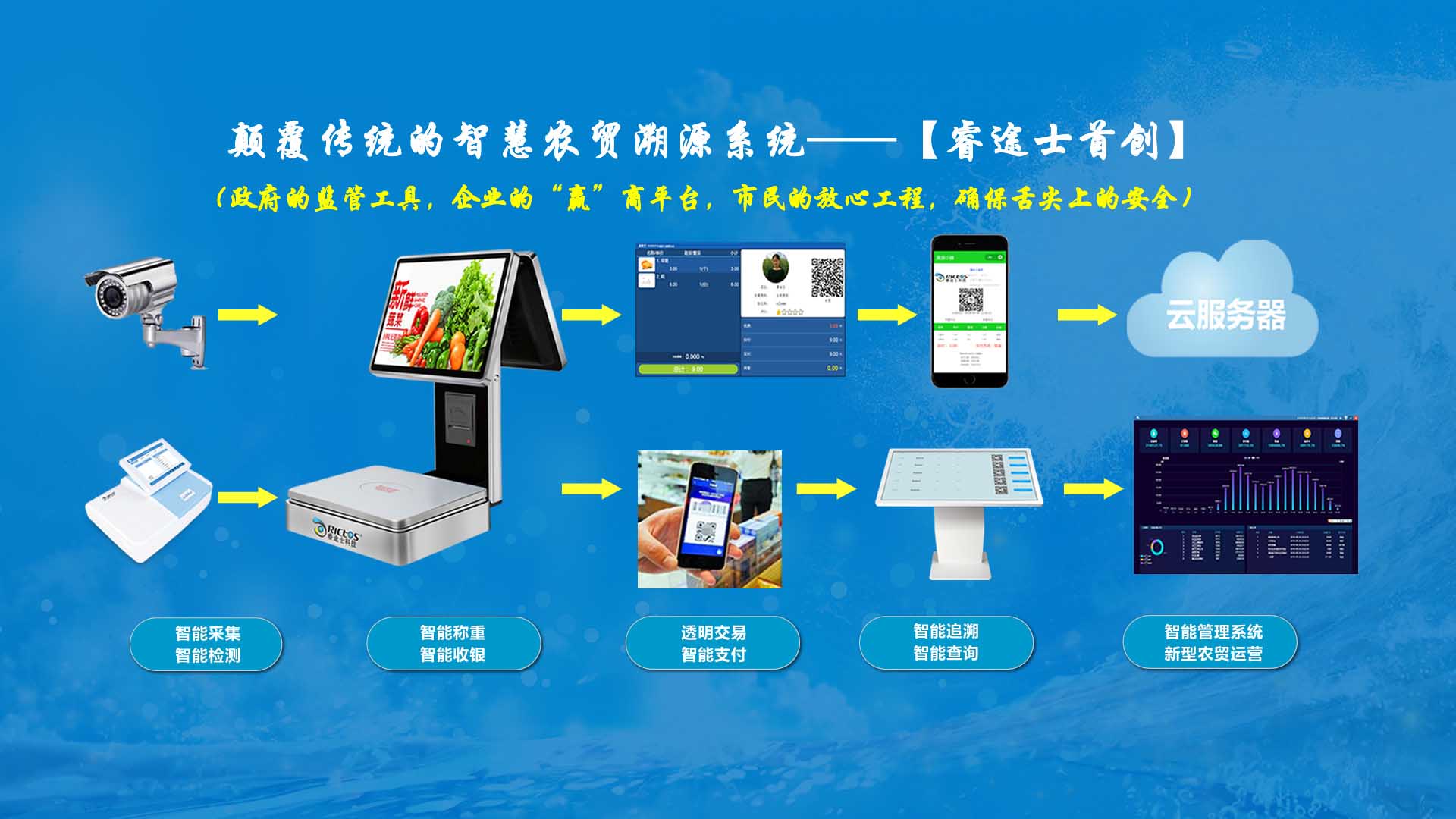 創(chuàng)新實(shí)現(xiàn)了【智慧農(nóng)貿(mào)溯源管理系統(tǒng)】與【智能稱(chēng)重收銀】一體化解決方案,集市場(chǎng)管理、運(yùn)營(yíng)管理、溯源追溯、智能收銀大數(shù)據(jù)運(yùn)用于一體,硬件、軟件與管理系統(tǒng)完美結(jié)合。適用于農(nóng)批、農(nóng)貿(mào)市場(chǎng)蔬菜、生鮮、水果、水產(chǎn)、肉類(lèi)、熟食等稱(chēng)重和非稱(chēng)重銷(xiāo)售;由于采用一體化設(shè)計(jì),解決了傳統(tǒng)農(nóng)貿(mào)市場(chǎng)無(wú)法實(shí)現(xiàn)的信息化、智能化、可追溯的管理問(wèn)題;使稱(chēng)重、收銀、追溯、管理、更透明、公正、安全,讓顧客無(wú)后顧之憂(yōu),給管理工作帶來(lái)極大的便捷與高效,對(duì)國(guó)內(nèi)農(nóng)產(chǎn)品行業(yè)的發(fā)展、農(nóng)產(chǎn)品流通管理起到了典范作用。 【睿途士首創(chuàng)】顛覆傳統(tǒng)的“智慧農(nóng)貿(mào)市場(chǎng)系統(tǒng)”,解決了傳統(tǒng)農(nóng)貿(mào)系統(tǒng)單一安卓掛屏,昂視不方便看、不直觀(guān)、無(wú)互動(dòng)性,傳輸信息不齊全、不穩(wěn)定的問(wèn)題,也解決了按鍵電子秤商品難找、商品代碼難記、按鍵操作不靈活、支付不智能,對(duì)收銀管理、銷(xiāo)售商品、菜名、菜價(jià)、打折、優(yōu)惠、會(huì)員、線(xiàn)上下單、采購(gòu)等無(wú)法實(shí)現(xiàn)實(shí)際菜品交易和追溯等問(wèn)題。 更具顛覆性的是睿途士智慧系統(tǒng)擁有三大管理平臺(tái)(市場(chǎng)管理平臺(tái)、總部運(yùn)營(yíng)管理平臺(tái)、商戶(hù)后臺(tái)管理平臺(tái))、一個(gè)可視操作前臺(tái)和三大追溯功能,讓遠(yuǎn)程管理、數(shù)據(jù)傳輸、人機(jī)互動(dòng)、智能控制、移動(dòng)支付、大數(shù)據(jù)、互聯(lián)通信、云端存儲(chǔ)、人工智能、智能城市、電子定位、智能收銀等功能得以實(shí)現(xiàn)。