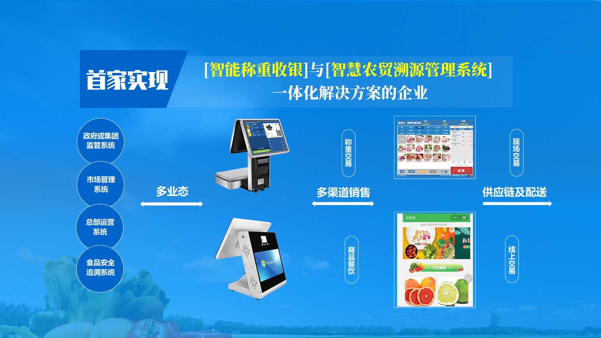 統(tǒng)一管理系統(tǒng)、規(guī)范溯源秤重、杜絕缺斤少兩、提升市場(chǎng)信譽(yù)度,革新市場(chǎng)營(yíng)銷(xiāo)和集群推廣模式。