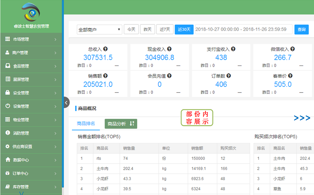 智慧管理 智慧農(nóng)貿(mào)方案通過一系列市場提升智能化建設,利用集群效應,建立以市場為主體,面向政府監(jiān)管部門、市場管理方、經(jīng)營商戶、消費者等多個群體的產(chǎn)業(yè)圈,參與到市場經(jīng)營環(huán)節(jié)中,逐步改變以收租為主的單一商業(yè)模式,提升市場競爭力,促使傳統(tǒng)市場的轉型, 形成具有互聯(lián)網(wǎng)基因,具備大數(shù)據(jù)分析金融創(chuàng)新的新型智慧菜市場,確保舌尖上的安全。