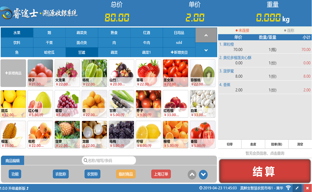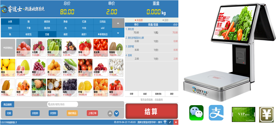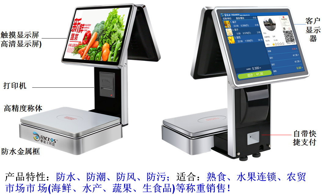 公司目前創(chuàng)新實現(xiàn)了收銀稱重一體化解決方案和智慧農(nóng)貿(mào)市場·溯源管理系統(tǒng),硬件、軟件與管理系統(tǒng)完美結合。適用于農(nóng)批、農(nóng)貿(mào)市場蔬菜、生鮮、水果、水產(chǎn)、肉類、熟食等稱重收銀一體化系統(tǒng);由于采用一體機設計,智慧農(nóng)貿(mào)方案解決了傳統(tǒng)農(nóng)貿(mào)市場無法實現(xiàn)的信息化、智能化、可追溯的管理問題;使稱重、收銀、追溯更透明、公正、安全,讓顧客無后顧之憂。