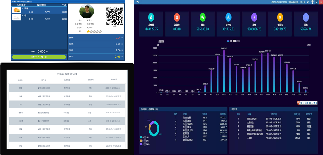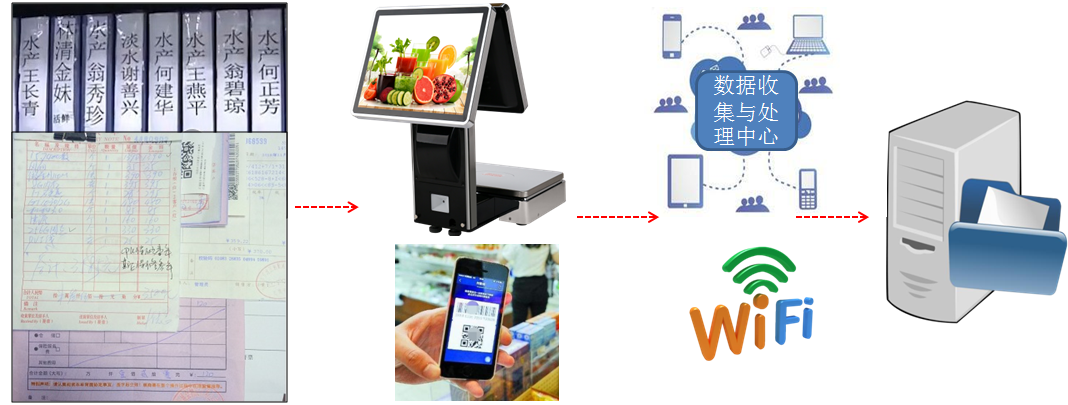 在智能農(nóng)貿(mào)溯源收銀秤上集成:觸摸、圖片展示、稱重、交易顯示、收銀、會員、移動支付、IC卡支付,通過智能設備的應用提供便捷的購物方式。對市場信息數(shù)據(jù)庫(進貨量、交易額)進行綜合挖掘分析,形成市場大數(shù)據(jù)。通過對數(shù)據(jù)信息的應用,動態(tài)掌握市場經(jīng)營狀況,為經(jīng)營決策、調(diào)控預警提供數(shù)據(jù)支撐,形成新型市場管理經(jīng)營模式。