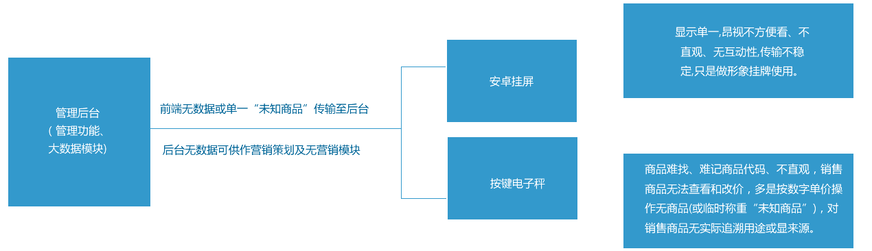 | 2.5 | 智能掃描支付 | 收銀系統(tǒng)、掃描硬件與支付一體化,被掃支付操作更便利,更安全、統(tǒng)一管理更規(guī)范,能做到資金池聚集和相關(guān)銀信福利有效運用,推動市場高效運營。 | 市場為各自二維碼外掛,操作效率低、顯示凌亂,不安全,無法管理,形成不了資金池及相關(guān)銀信福利。 |